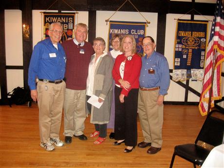 Charlottesville Makes Interclub Visit to Waynesboro. Four members of the leadership team from the Charlottesville Kiwanis Club made an interclub visit to the lunch meeting of the Waynesboro Club at the Waynesboro Country Club on October 19. Pictured from left are Division 5 Lt Gov Herb Ely, Charlottesville President Jim Hart, Division 5 Immediate Past Lt Gov Kathy Johnson, Charlottesville President-Elect Barb Ritter, Waynesboro President Jennifer Apesa, and Charlottesville Immediate Past President Don Foss. Don delivered a very impressive power point presentation illustrating the success of the Charlottesville Service Leadership Program, which he serves as committee chair. Also, PLG Kathy Johnson presented the Home Club Banner to LTG Herb Ely, where it will be on display in Charlottesville for the next two years.