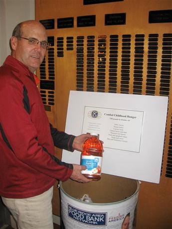Charlottesville Raises 300 pounds of Food for Neighbors-4 Neighbors. The Kiwanis Club of Charlottesville organized a four-week food drive aimed at putting a dent in the hunger suffered by area children and youth. Inspired by Western Albemarle High School Key Clubber's award-winning Neighbors-4-Neighbors concept, the Charlottesville Kiwanians sought to bring in food identified by the food bank as in greatest demand and in shortest supply especially for children and youth. The Blue Ridge Area Food Bank provided a barrel which stood ready to accept donations at the regular Kiwanis meeting place, the Elk's Lodge, between September 20 and October 18. When all was said and done, 324 pounds of 100% juice, peanut butter, canned fruits, macaroni and cheese, pasta and spaghetti sauce, healthy cereal, and canned soups and stews was picked up by the food bank. Nicole Muller, the Capital District Teenager of the Year, reported that this food provided meals for 253 people, 101 of them children. Pictured is Charlottesville Kiwanian Bill Hall inspecting the contributions.