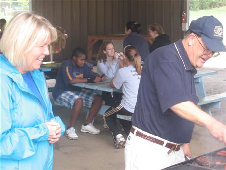 Charlottesville K-Family Kickball Cookout at Camp Holiday Trails. More than fifty volunteers representing members from all five Key Clubs in Division 5A, CKI members from the University of Virginia, and Charlottesville Kiwanians came together on October 3 for a Sunday afternoon service extravaganza at Camp Holiday Trails, a summer camp for children with special health needs. The afternoon began with a cookout presided over by Charlottesville Service Leadership Committee chair Don Foss, shown at the grill being assisted by Monticello High School Key Club Faculty Advisor Diane Clark. The volunteers were then organized by Fifth Division Key Club Lt Gov Diana Stan of Western Albemarle High School, into four teams of ten players each. While two teams played kick ball, two teams engaged in service work including moving tables, chairs, and lawn furniture used at a CHT function the night before, raking leaves, and performing other tasks provided by staff at Camp Holiday Trails. The teams would then alternate activities until all the tasks were accomplished and the kick ball games were concluded. A beautiful Sunday afternoon was spent in K-Family fellowship while accomplishing a much needed set of tasks for one of the area's most popular children's charities.